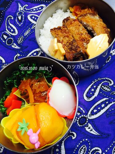 今日は雨が時折強く降ってます。☔ 今朝作ったお弁当でーす! とはいっても昨日の夕飯のカレーにカツをのせただけの「カツカレー」です。 しかもカツも一昨日の夕飯の残りのポークソテーにパン粉をつけて揚げ焼きしただけですがね。あとはいつもの次男の要望…