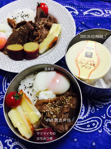今日は雨時々曇り~ですかね? 明後日は寒くなりそうです。鳥海山初冠雪かも・・・ 今朝作ったお弁当です。次男が好きなすき焼き弁当! でも、あまり量が多いと眠くなるというのであっさりと!プリンも添えましたよ! サツマイモのはちみつ煮は、圧力鍋料理…